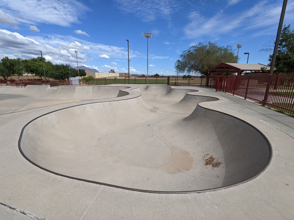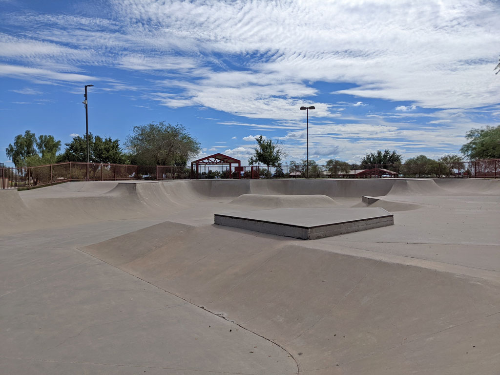 Apache Junction Skate Park is located inside of Superstition Shadows Park in Apache Junction, Arizona. This 22,000 square foot concrete skatepark was completed in 2002 by Site Design Group. This park is great for transition skaters thanks to its large, lazy river-style bowl. There are a variety of banks that lead down to a step-up/Eurostyle box near the center. The edges of the park are flanked with ledges, rails, and boxes to practice your grinds and flip tricks.