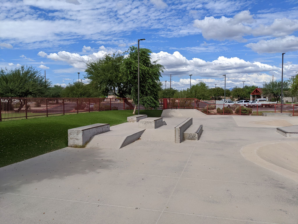 Apache Junction Skate Park is located inside of Superstition Shadows Park in Apache Junction, Arizona. This 22,000 square foot concrete skatepark was completed in 2002 by Site Design Group. This park is great for transition skaters thanks to its large, lazy river-style bowl. There are a variety of banks that lead down to a step-up/Eurostyle box near the center. The edges of the park are flanked with ledges, rails, and boxes to practice your grinds and flip tricks.