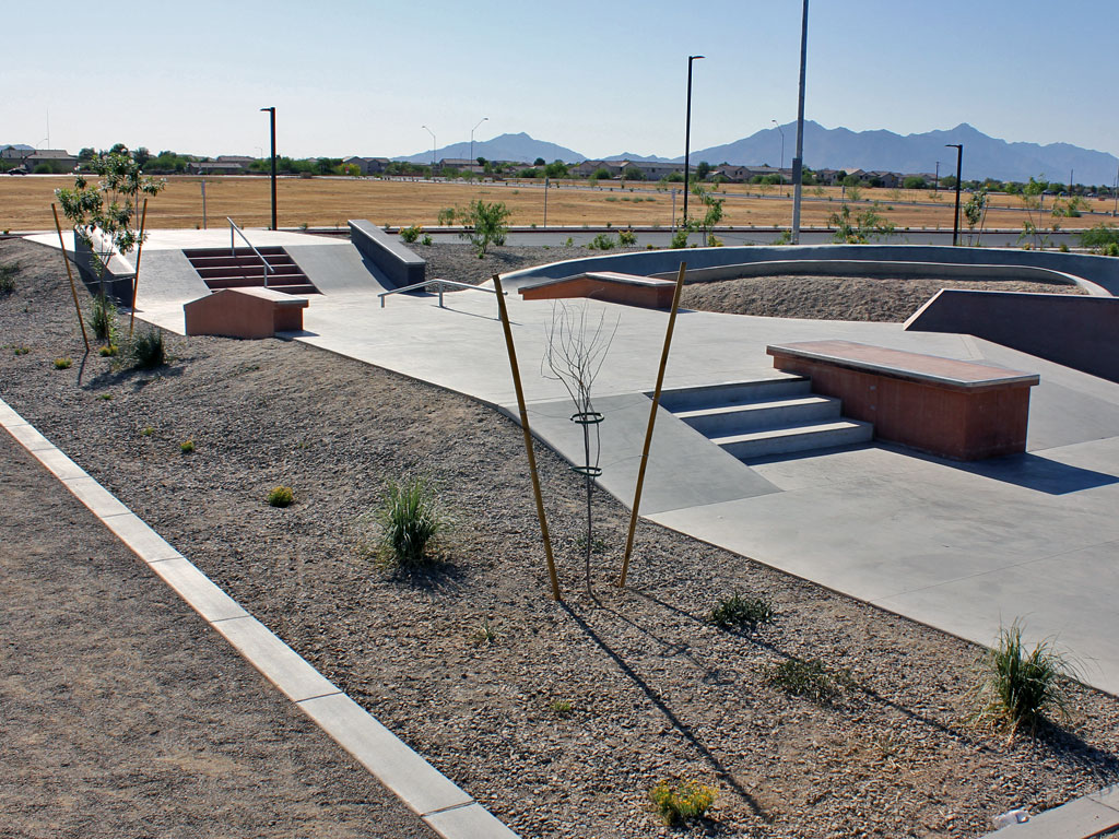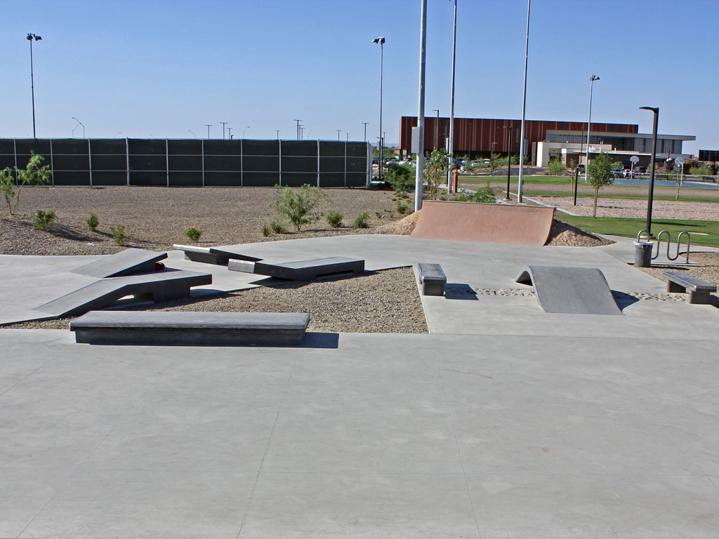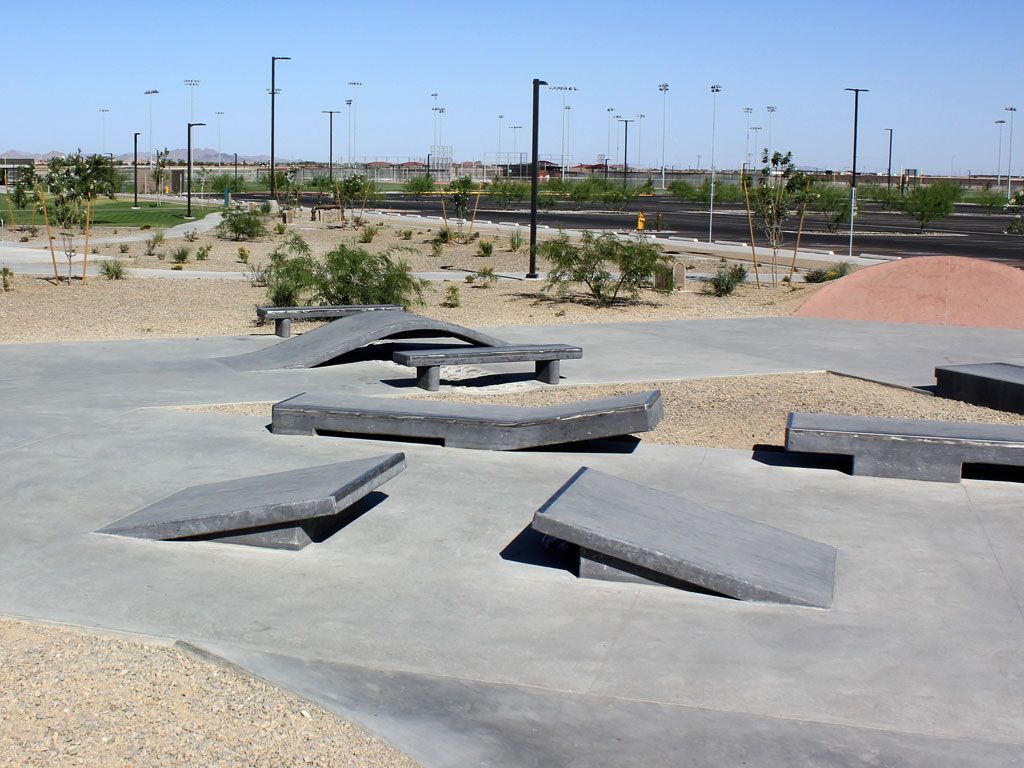 Copper Sky Regional Park in Maricopa, Arizona offers skaters a street-style skate plaza to practice their skills. The park features a variety of ledges, stairs, and transitions along with an unusual curved ramp and two sets of doubles with gaps in the middle. A short "snake run" offers limited options for vert skaters - there is no in-ground bowl here. Park has lights for skating from sunset to park close.