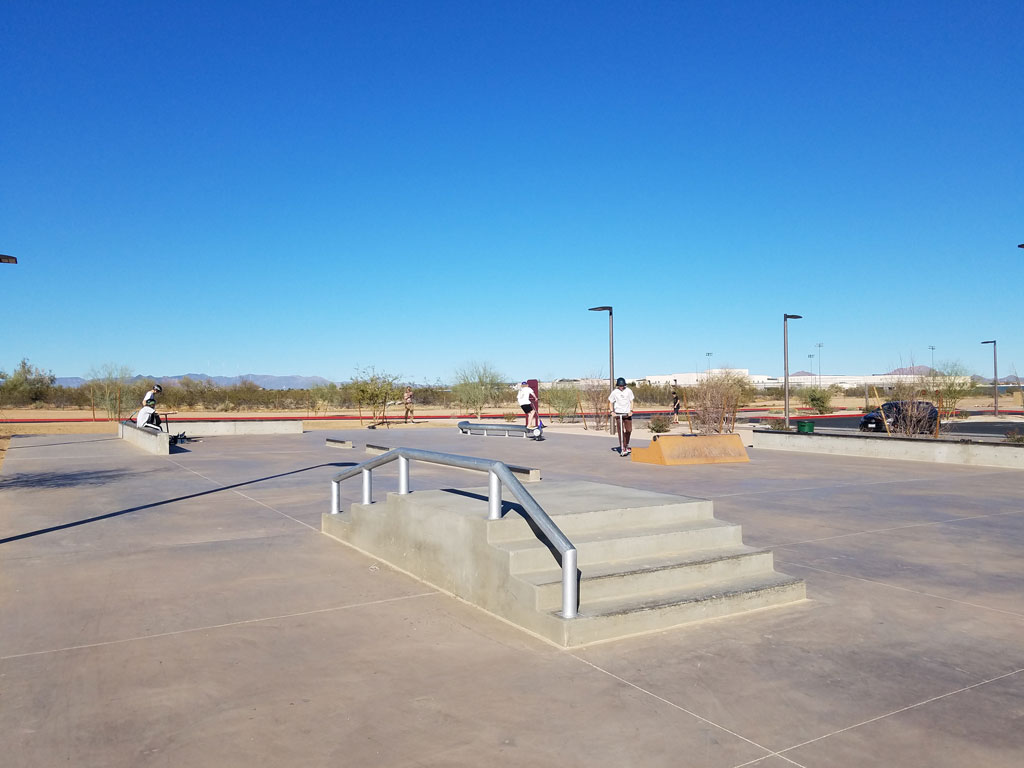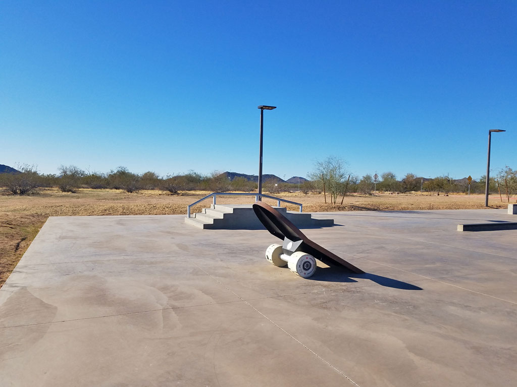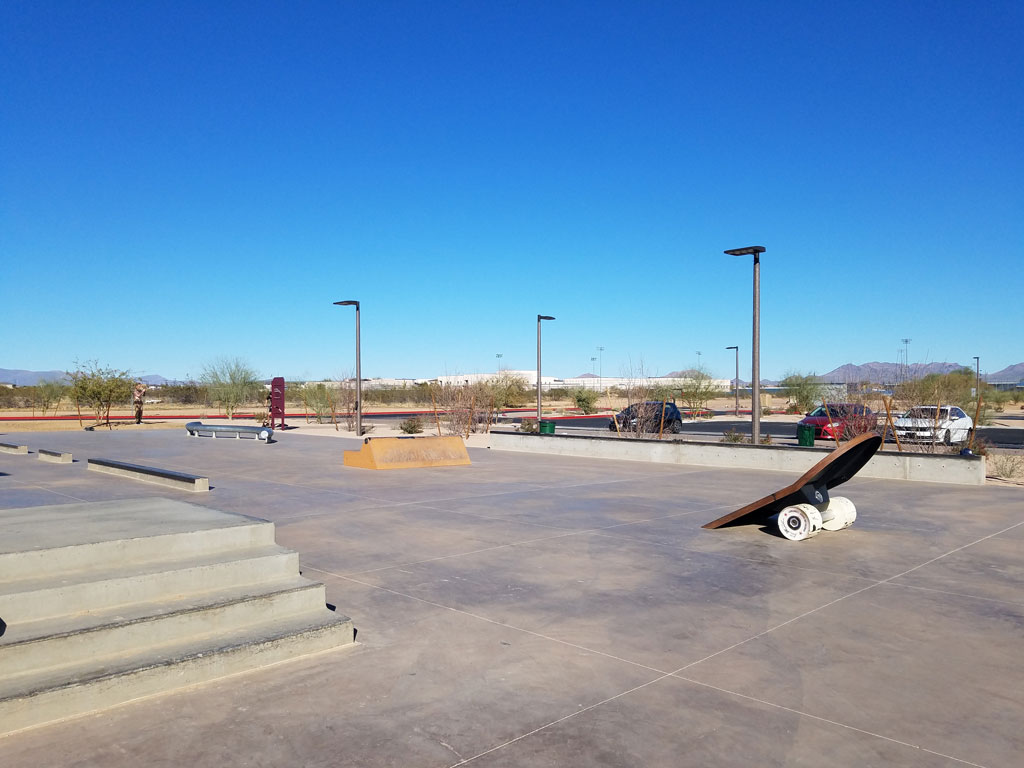 Phoenix Pinnacle Skate Park is located inside of Pinnacle Park in Phoenix, Arizona. This 6,500 square foot concrete skatepark was completed in 2020 by American Ramp Company. This small neighborhood skate plaza is located in a city park behind Pinnacle High School. This park is filled with unique and interesting ramps and obstacles. A banked ramp looks like half of a skateboard sticking up out of the ground. There is a large S-curve rail for grind tricks. There is a Jersey barrier style barricade, a 3-stair and 4-stair combination set with rail. There are three tall ledges with coping, and three smaller ledges with coping. There are no bowls or transition areas at this park. The park is equipped with lights for night use.