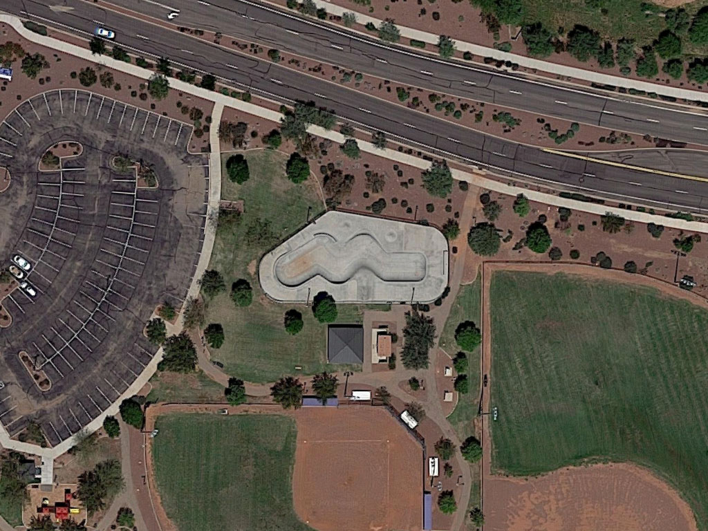 Red Rock Skate Park is located inside of Red Rock Community Park in the unincorporated community of Red Rock, Arizona. This is a 10,000 square foot poured concrete skate park designed by Site Design Group. This park is essentially a large transition park with little to offer street skaters. A large squiggle shaped bowl has high banked walls with metal coping around the edges. There is a curved ledge in the corner of a park and two bump style elements on the top. This park is equipped with lights for night use.
