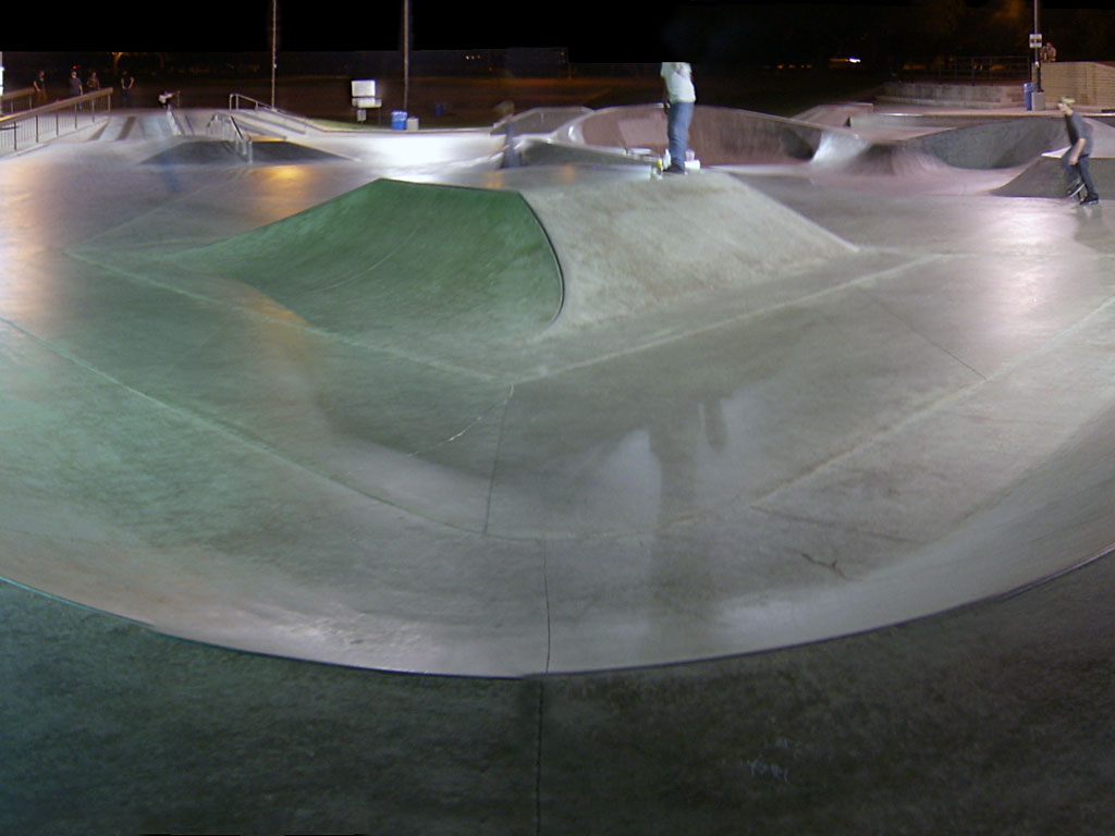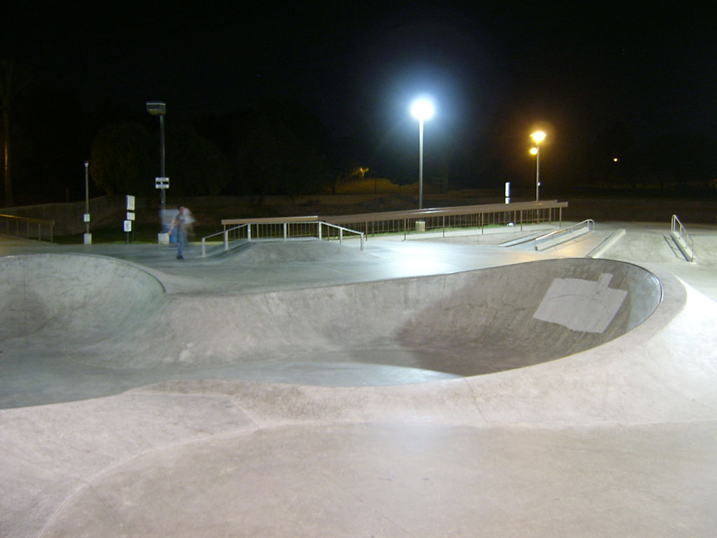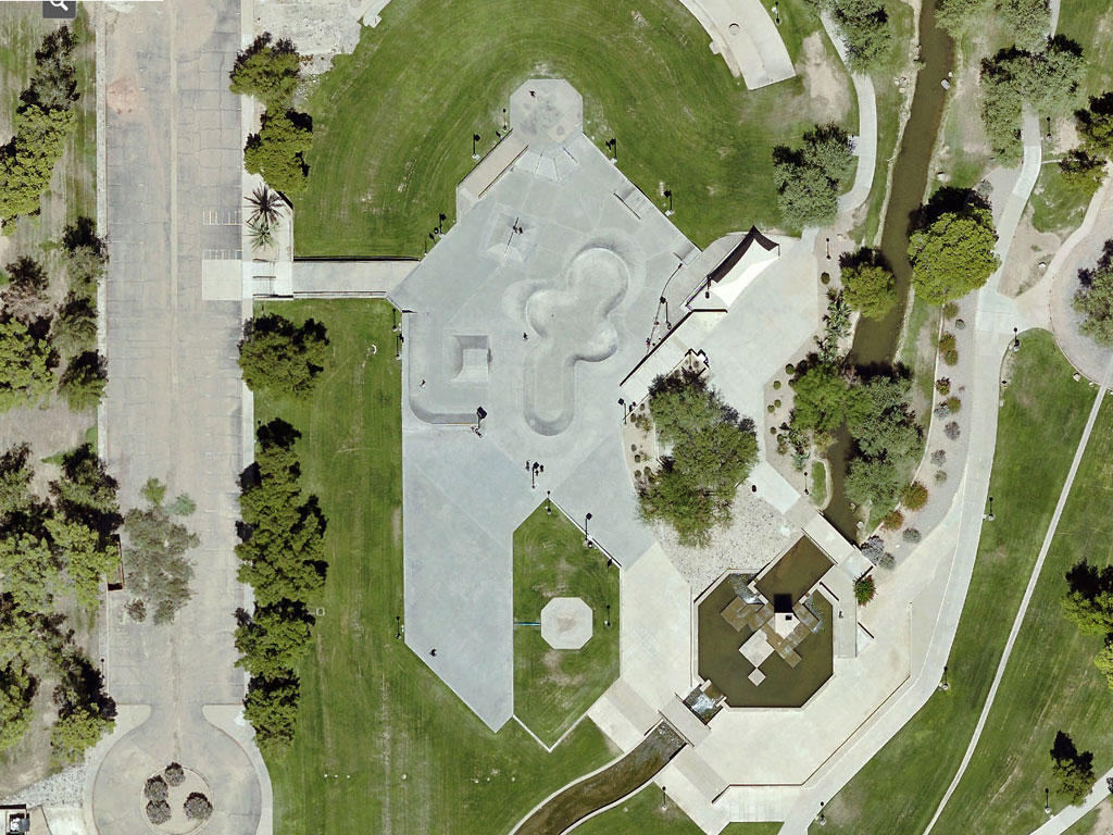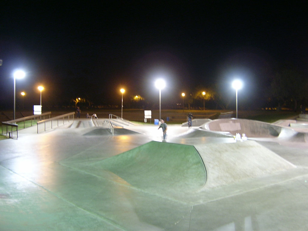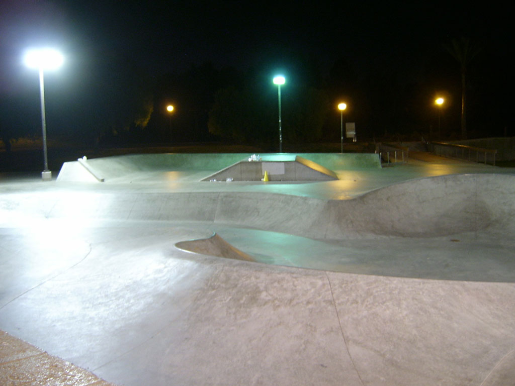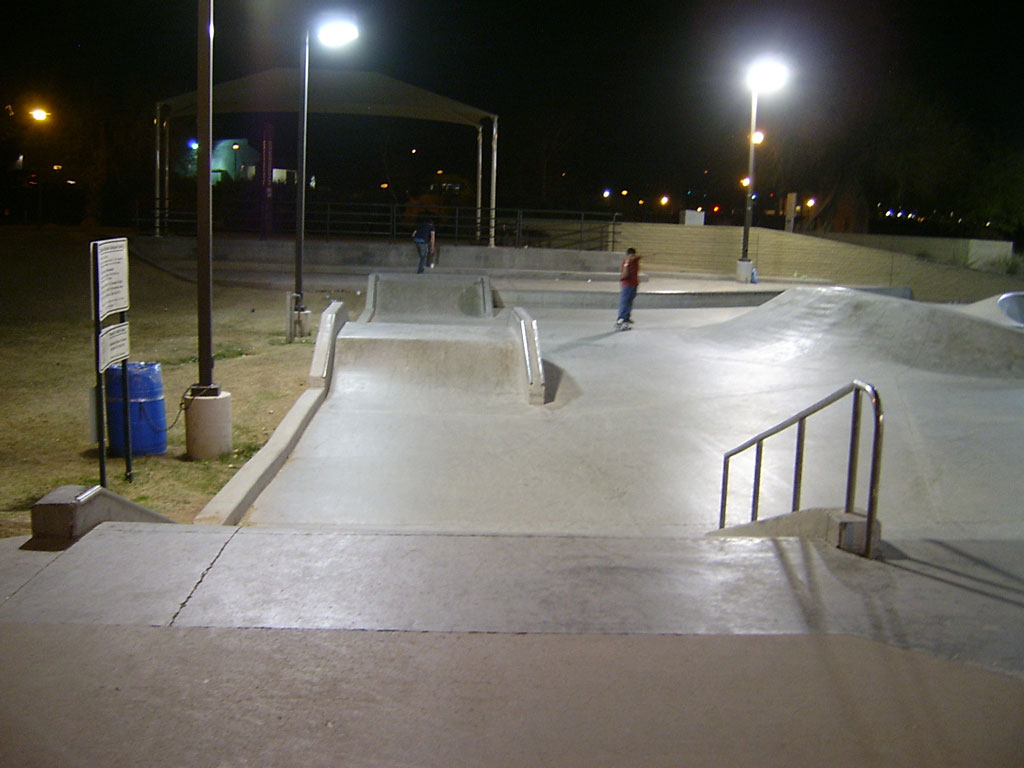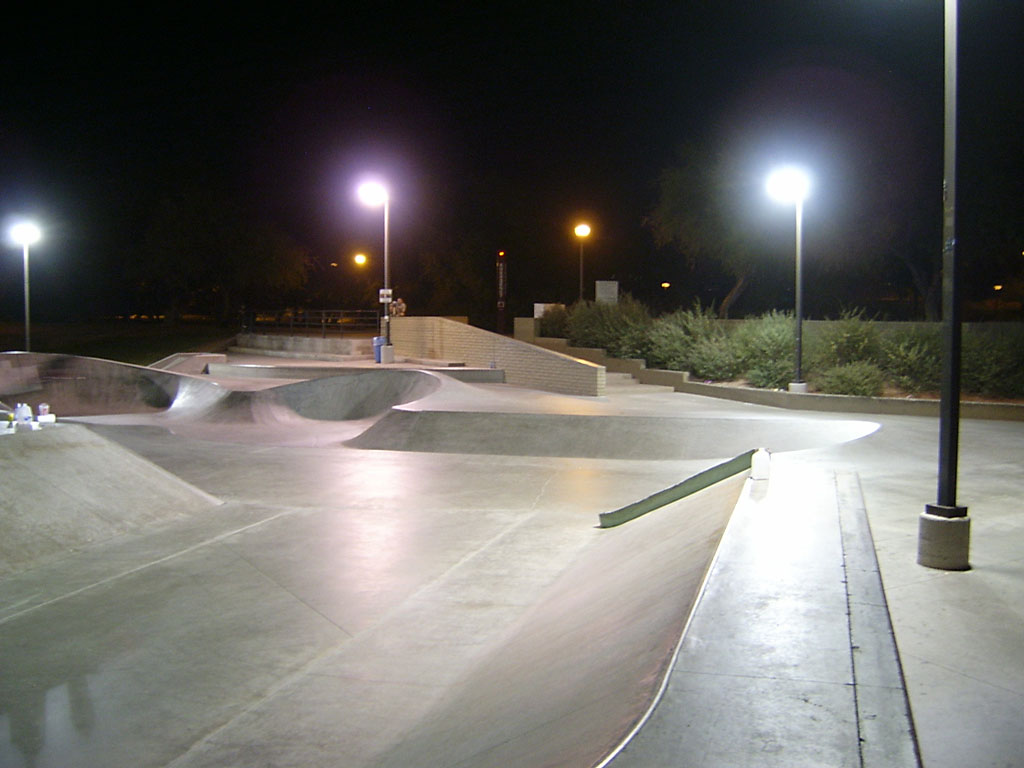 The Wedge Skate Park is located inside of Eldorado Park in Scottsdale, Arizona. This 21,000 square foot park has poured concrete construction. It is next to a large fountain and connected to multi-use paths that run throughout the long, linear park. The Wedge has an old-school bowl with some very steep angles that can be challenging to ride. There are two pyramid boxes and an L-shaped section of quarter pipe and transition ramps. The south end of the skate park has a large, flat area with grind rails. The park has a very open feel. While not part of the skatepark, many skaters ride the stair sets, hand railings, and walls around the fountain as obstacles. It is equipped with lights for night use.