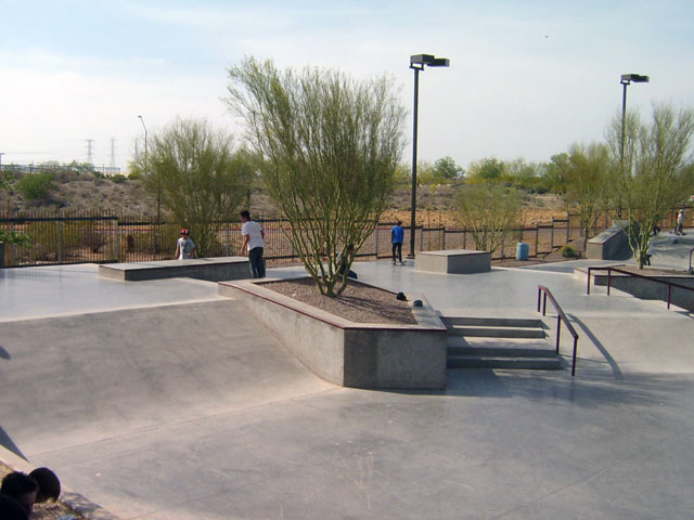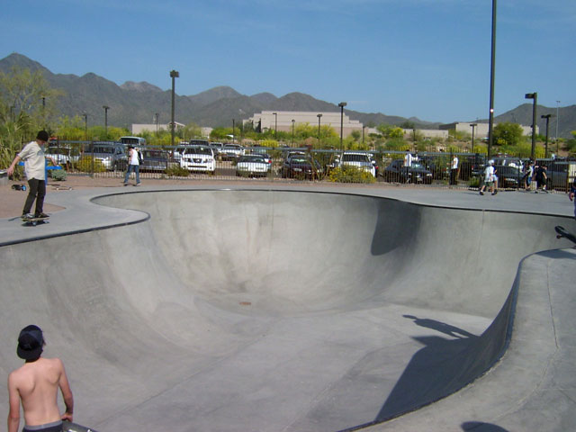 McDowell Mountain Ranch park in Scottsdale is home to this 16,000 square foot concrete skatepark. It features street-style planter boxes, boxes, banked transitions, and stair sets. Bowl riders will enjoy the lagoon-shaped bowl, which measures 10 feet deep. ACCESS CARD REQUIRED FOR ADMISSION.