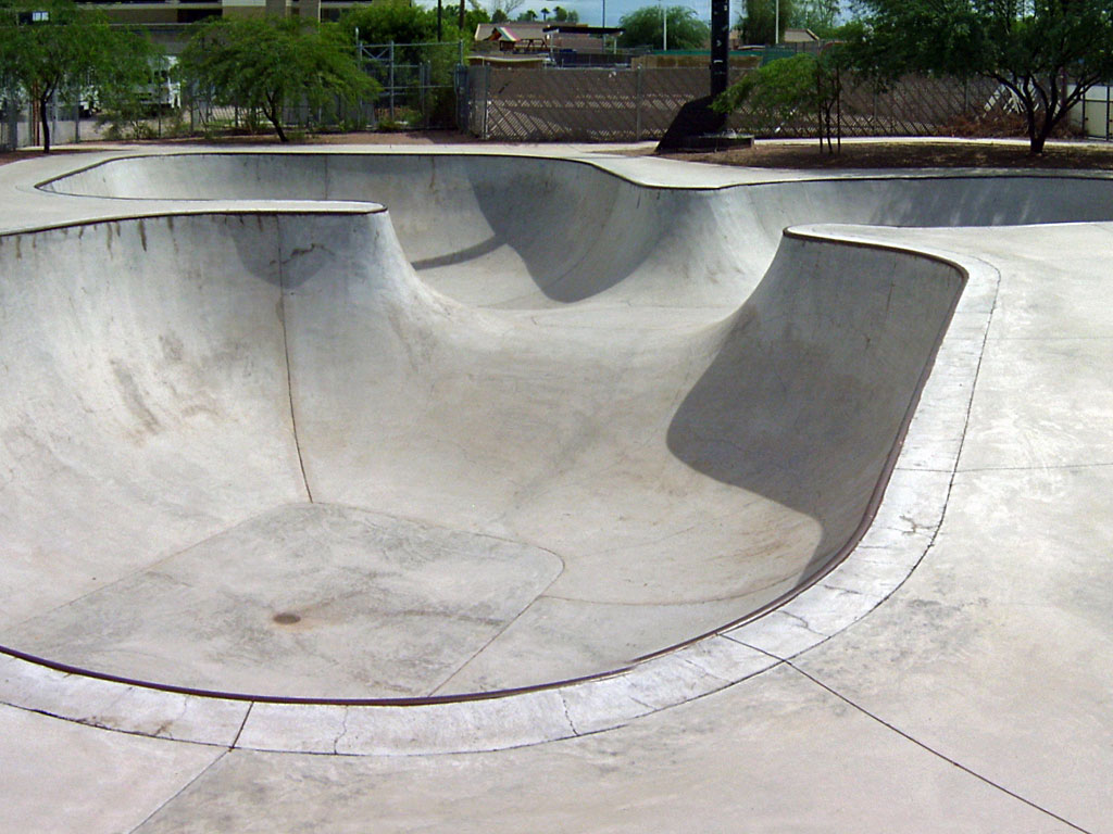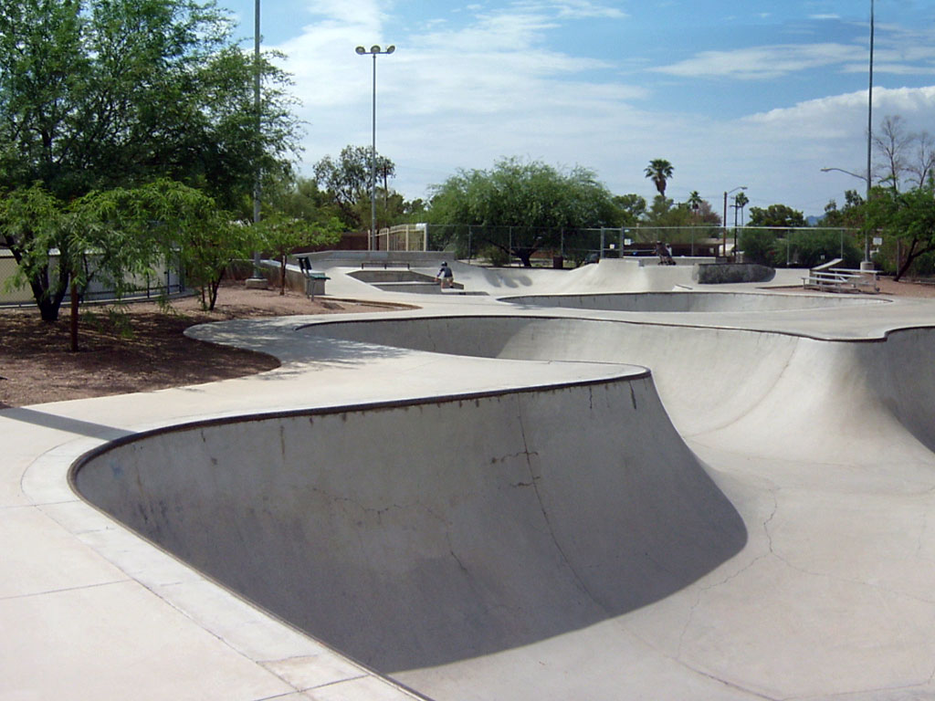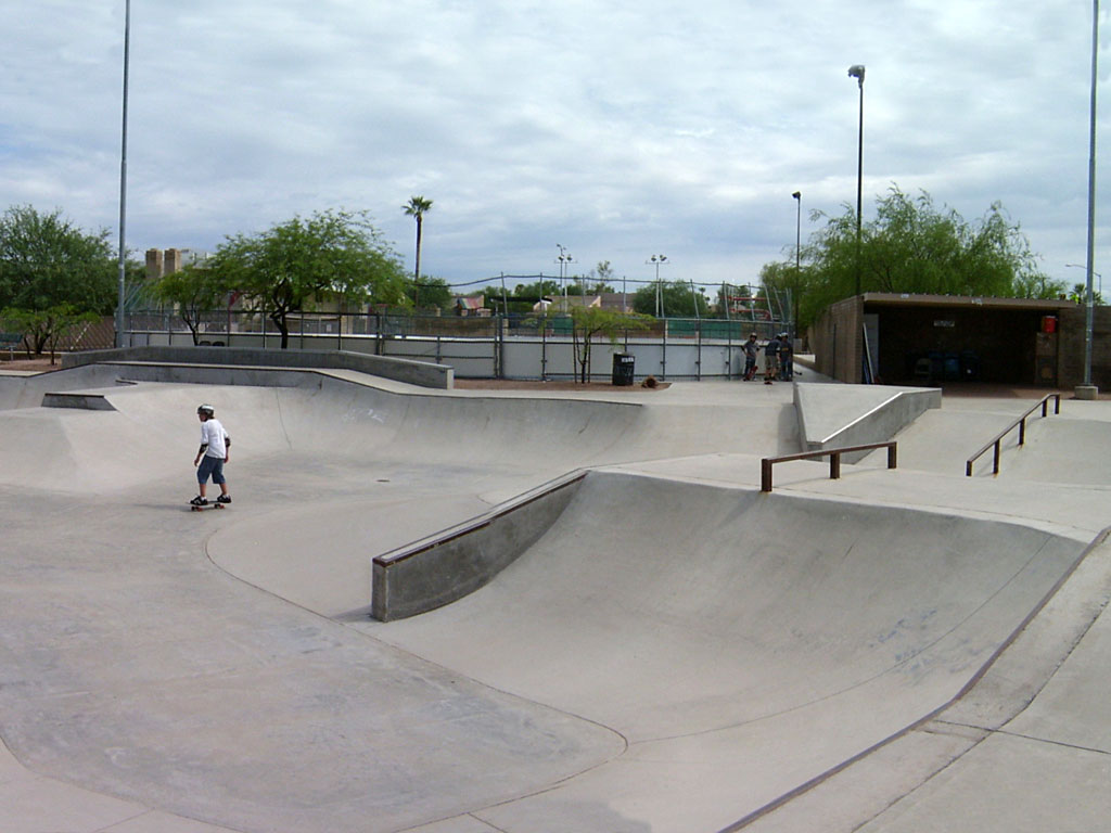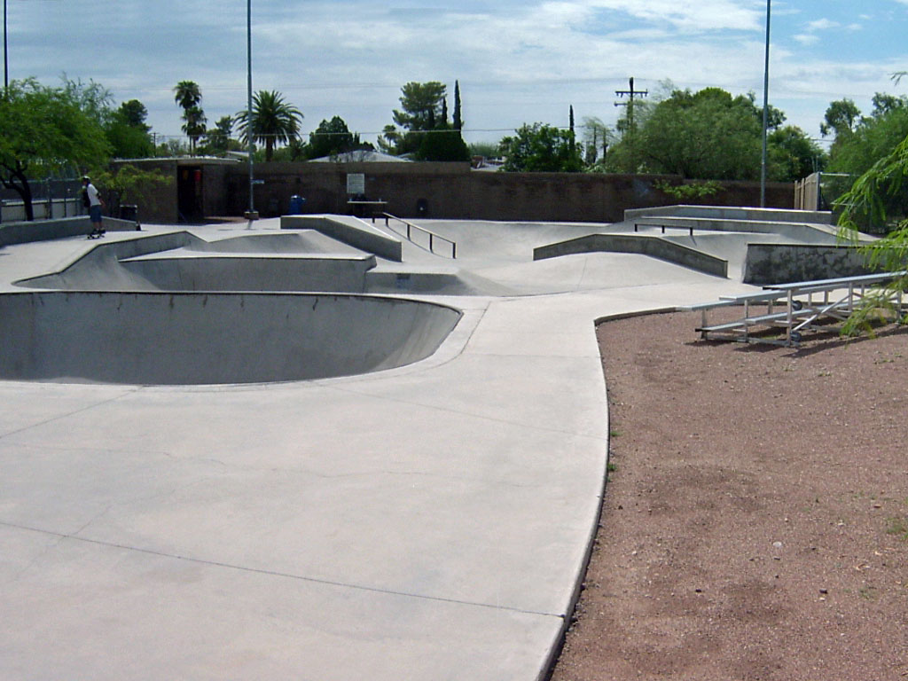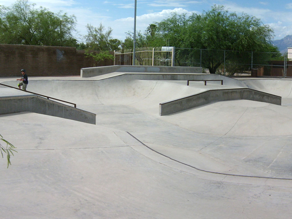 Ott Family YMCA Skate Park is located in Tucson, Arizona. It is a 15,000 square poured concrete skate park. To skate here, you will need a YMCA membership or day pass. This is a well designed park with a large 3-clover bowl, smaller bowl with spine transfer, and a street-style area. The park has transition areas with fun boxes and grind rails to practice your skills. Two long ledges provide grind opportunities. A shaded seating area offers a great spot to rest. Contact the Ott Family YMCA for hours.